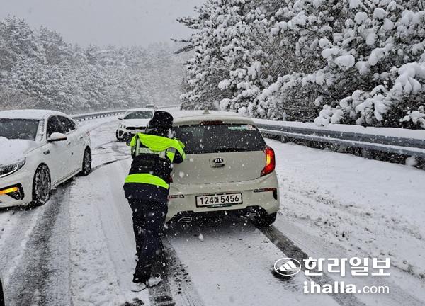 빙판길에 고립된 차량을 국가경찰이 밀고 있다. 사진=제주경찰청 제공
