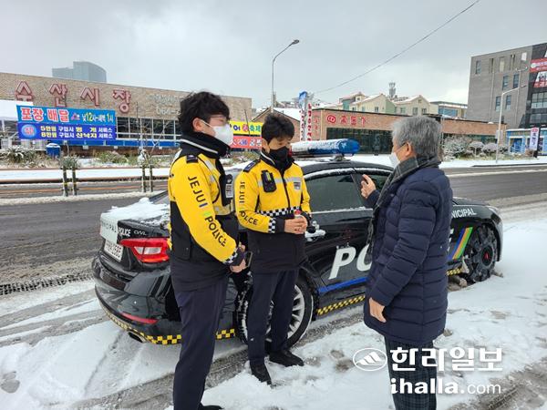 강호준 제주도 자치경찰위원회 사무국장이 폭설 현장에 근무하는 자치경찰관을 격려하고 있다. 사진=제주경찰청 제공