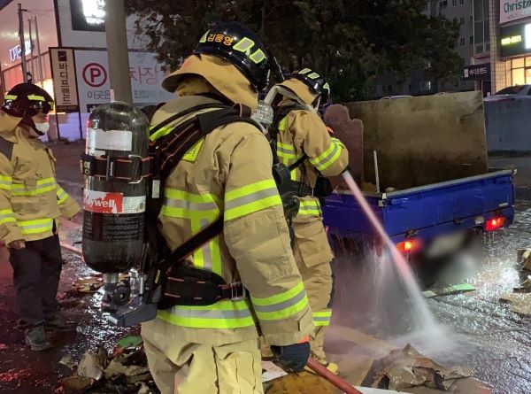 29일 서귀포시 동홍동 동홍사거리 인근에서 발생한 트럭 적재함 화재 현장. 사진=서귀포소방서 제공