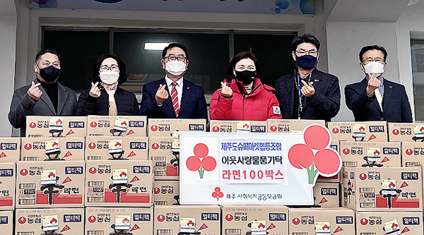제주도수퍼마켓협동조합(이사장 김대권)은 지난 29일 제주시청을 방문해 라면 100박스(370만원 상당)를 기탁했다. 김대권 이사장은 "나눔 활동을 꾸준히 실천하는 사업장이 되도록 노력하겠다"고 말했다.