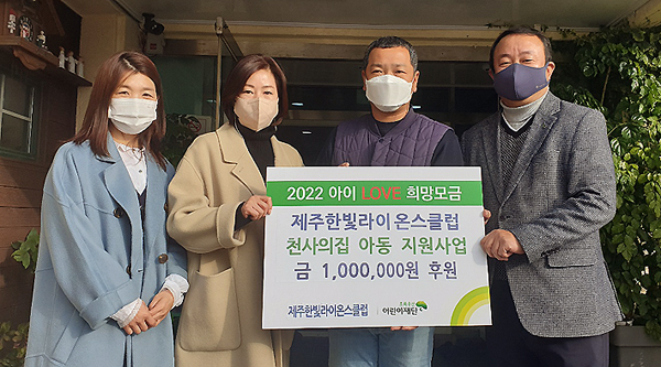 제주한빛라이온스클럽(회장 김정실)은 지난 28일 초록우산 어린이재단을 통해 서귀포시에 위치한 천사의집에 아동지원금 100만원을 후원했다.