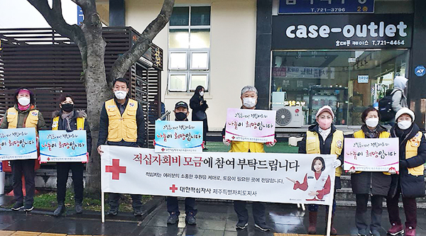 대한적십자사제주특별자치도지사는 지난 27일부터 31일까지 청솔봉사회(회장 홍신자), 용담1동봉사회(회장 김영철) 등 30여명이 참여한 가운데 법원사거리, 제주버스터미널, 용담1동 일대에서 희망나눔 모금 참여 홍보 캠페인을 벌이고 있다. 이번 캠페인은 도민들의 모금 참여를 독려하기 위해 진행됐으며, 봉사원들은 거리에 시민들을 대상으로 성금 모금 동참을 호소했다.