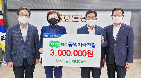 효돈농협(조합장 백성익)은 최근 효돈농협 본점에서 하나로마트 공익기금 300만원을 제주사회복지공동모금회에 기탁했다. 이날 전달된 공익기금은 지역사회 사회복지기관과 어려운 이웃들에게 전달될 예정이다.