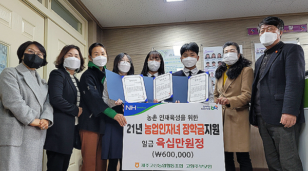 제주고산농협 고향주부모임(회장 고금순)은 지난 29일 고산중학교에서 농업인 자녀 재학생 3명에게 장학금 60만원을 지원했다. 장학금은 고향주부모임 회원들이 공동소득사업 등을 통해 조성한 기금으로 마련됐다.