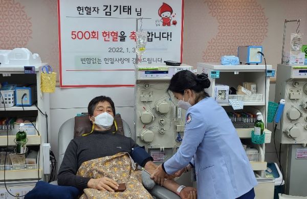 김기태씨가 3일 제주시 헌혈의 집 한라센터에서 500번째 헌혈을 하고 있다. 사진=대한적십자사 제주특별자치도혈액원 제공