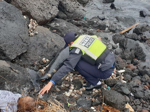 5일 제주시 한경면 한경해안로 인근 갯바위에서 발견된 상괭이 사체. 사진=제주해양경찰서 제공