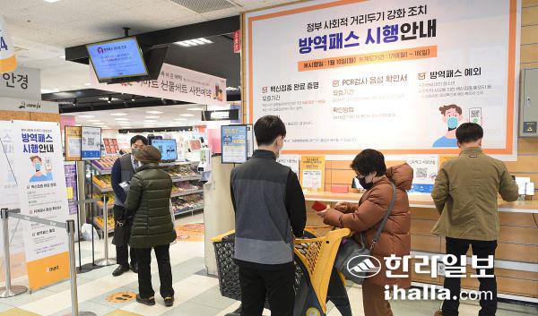 10일부터 대형마트, 백화점 등이 방역패스 의무적용 시설로 확대 되면서 이날 도내 대형마트를 찾은 시민들이 매장 입구에서 코로나19 백신접종 증명서를 확인받고 있다. 이상국기자