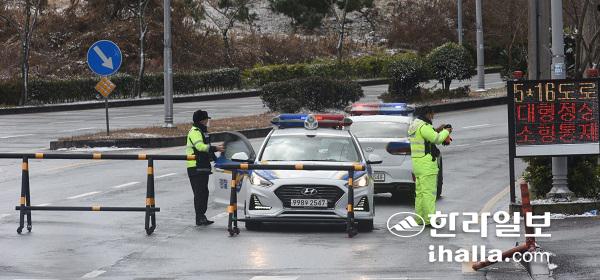 11일 제주대학교 사거리 516도로 입구에서 경찰들이 차량통제를 하고 있다. 이상국기자