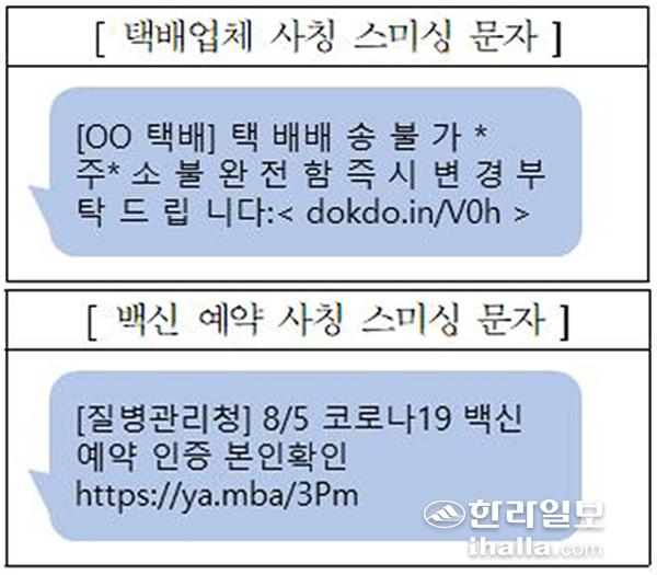 【A】설 연휴를 앞두고 택배업체를 사칭한 스미싱(문자메시지 보이스피싱)이 증가할 것으로 예상된다. 또 코로나 상황과 관련해 백신예약, 재난지원금 지급 등을 빙자한 문자도 빈번하게 발송되고 있으므로 조심해야 한다.