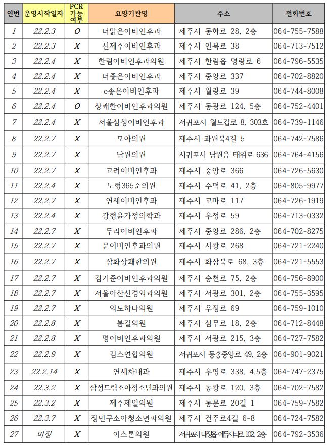 제주특별자치도 코로나방역대응추진단은 4일 동네 병의원 중 호흡기 진료 지정 의료기관 27곳의 명단을 발표하고 순차적으로 운영에 들어간다고 밝혔다.