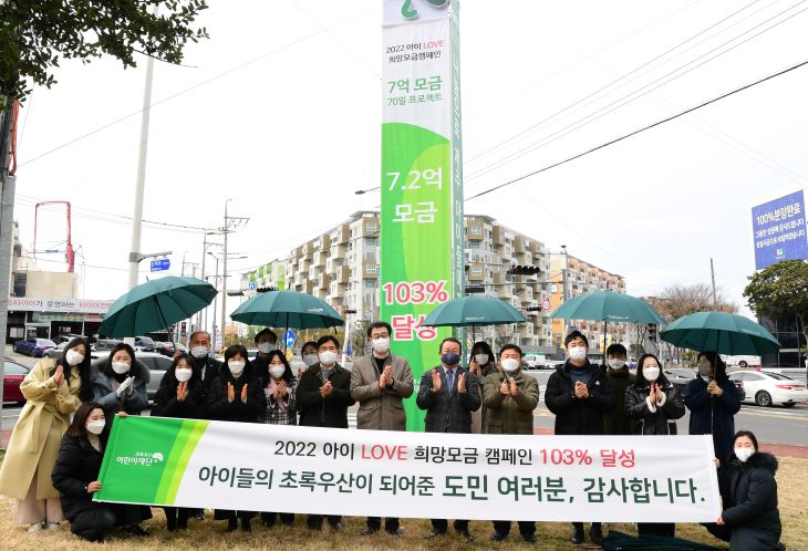 7일 초록우산어린이재단 관계자들이 제주시 연동 신시가지 입구 사거리의 캠페인 홍보탑 앞에서 '2022 아이 LOVE 희망모금 캠페인' 목표 모금액 달성을 축하하고 있다. 강희만기자