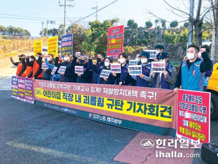 지난해 12월 22일 제주시의 한 어린이집 앞에서 열린 민주노총 제주본부의 기자회견. 한라일보DB