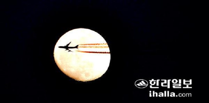 정월대보름을 이틀 앞둔 지난 2019년 2월 17일 저녁 제주시 연동에서 비행기가 둥근 달을 뚫고 지나가는 듯한 장면이 카메라에 잡혔다. 한라일보DB