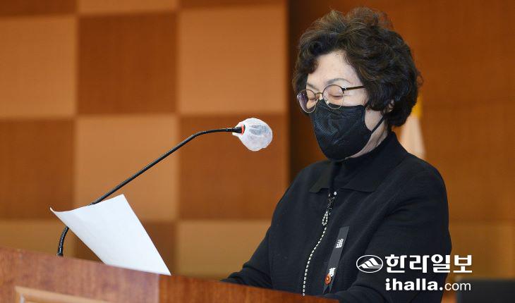 김석삼 희생자의 딸 김영순 씨가 74년 만에 만난 아버지를 향한 추도사를 발표하고 있다. 이상국기자