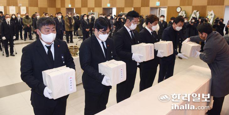 10일 제주4·3평화공원 평화교육센터에서 개최된 '4·3희생자 유해 신원확인 보고회'에서 4·3유족청년회원들이 희생자들의 유해를 운구하고 있다. 이상국기자