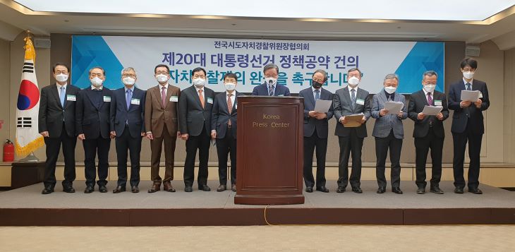 전국 18개 시·도 자치경찰위원장들은 10일 서울 중구 한국프레스센터에서 제20대 대통령 선거 후보들을 향해 자치경찰제 완성을 위한 정책 공약을 발표했다. 사진=전국시도자치경찰위원장협의회 제공
