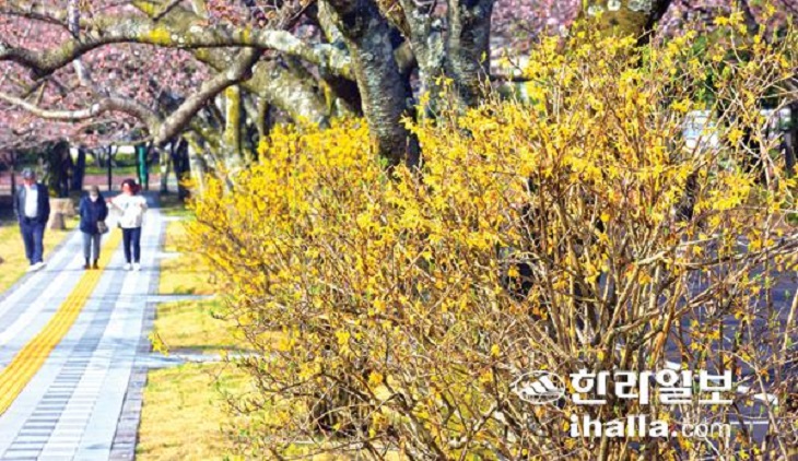 지난해 3월 14일 제주대학교 아라캠퍼스에서 만개한 개나리.