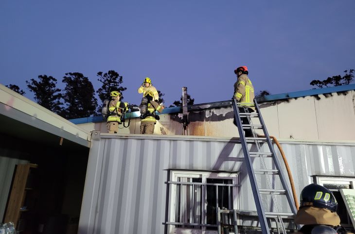 소방대원들이 지난 11일 오후 발생한 제주시 도련1동의 한 창고 건물 화재를 진압하고 있다. 사진=제주소방서 제공