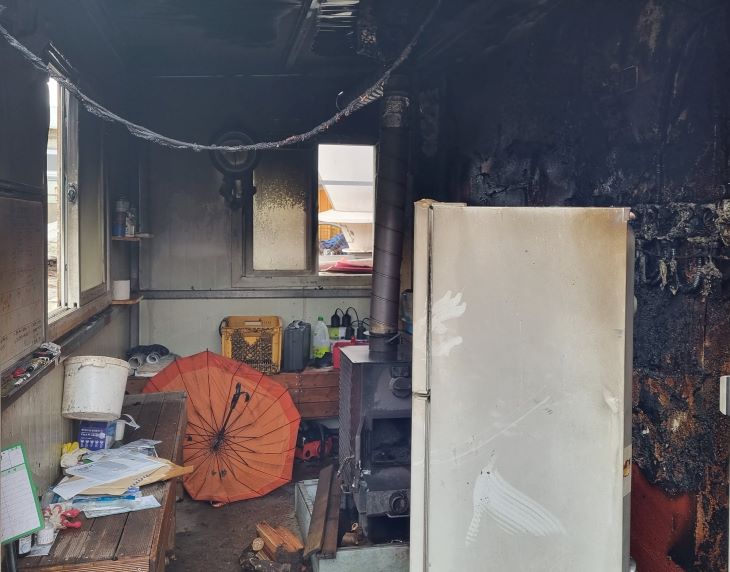 15일 오전 화재가 발생한 제주시 한림읍 한 양돈장 직원 휴게실의 모습. 사진=제주서부소방서 제공