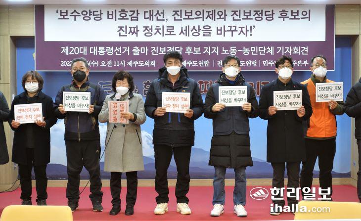 제주지역 노동·농민단체는 16일 제주도의회에서 기자회견을 열고 진보 정당 대선 후보에 대한 지지를 호소했다. 김도영기자