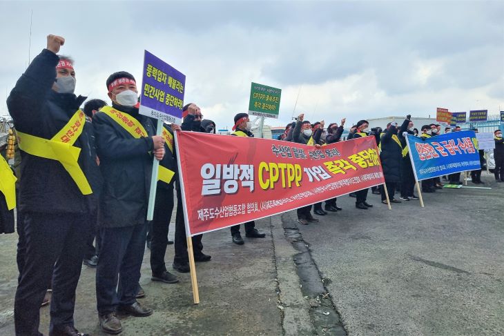 제주지역 어업인들이 정부의 포괄적·점진적 환태평양경제동반자협정(CPTPP) 가입 추진에 대해 규탄의 목소리를 냈다.