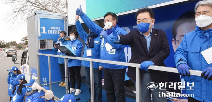 윤호중 더불어민주당 원내대표가 2일 제주시오일장에서 유세를 벌이고 있다. 이상국기자