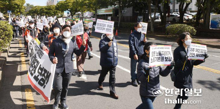 이날 70여명의 참석자들은 기자회견 이후 제주도청을 출발해 롯데시티호텔까지 왕복하며 정치 행진을 실시했다.