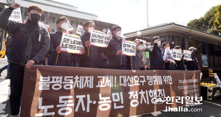 민주노총 제주본부와 전국농민회총연맹 제주도연맹, 전국여성농민회총연합 제주도연합은 2일 제주도청 앞에서 기자회견을 열고 "10대 대선 요구안 실현을 시작으로 노동자와 농민이 주인되는 세상을 만들어 가자"고 말했다.