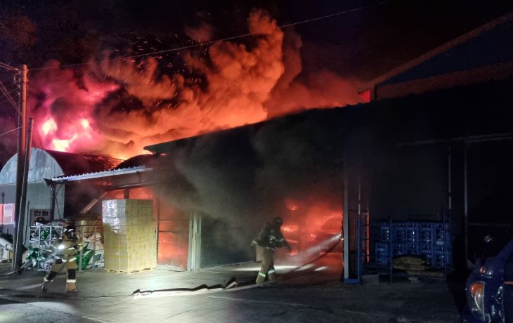 3일 새벽 제주시 한림읍의 한 육묘장에서 발생한 화재를 소방대원들이 진압하고 있다. 사진=제주서부소방서 제공