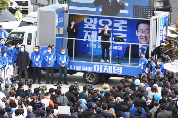 제20대 대통령선거를 이틀 앞둔 7일 제라진 이재명 제주선거대책위원회(이재명 제주선대위)는 제주를 찾은 이재명 후보의 총력 유세에 이어 도내 곳곳을 돌며 막판 표심 공략에 나섰다.