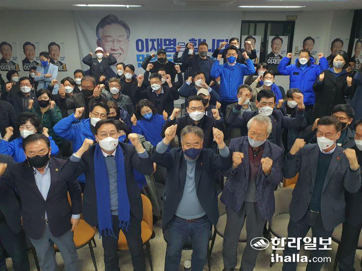 9일 오후 7시30분 제20대 대통령 선거 방송3사 출구조사 결과가 발표되자 더불어민주당 제주도당 관계자들이 승리를 자신하며 환호하고 있다. 강희만기자