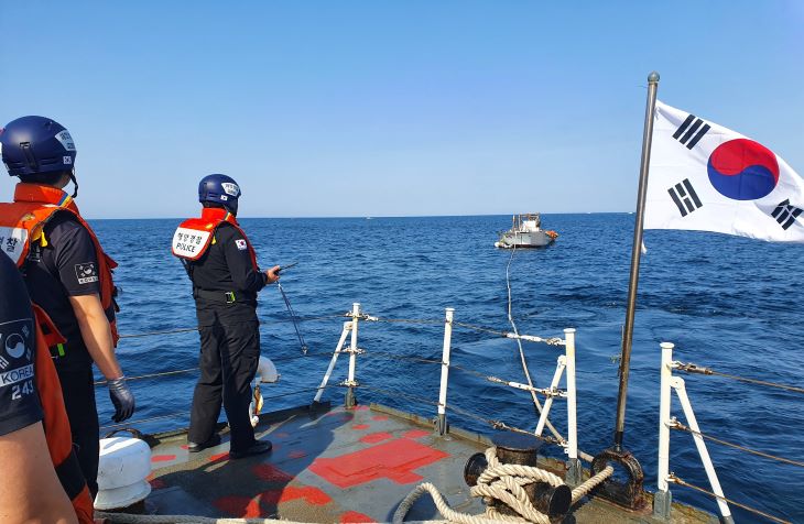지난 12일 제주시 김녕항 인근 해상에 표류하던 A호를 제주해경 경비함정이 예인하고 있다. 제주해양경찰서 제공
