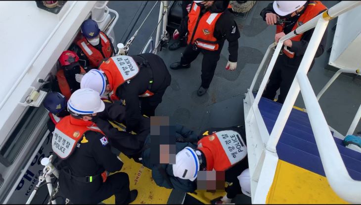 지난 12일 발생한 추자도 응급환자를 제주해경이 긴급 이송하고 있다. 제주해양경찰서 제공