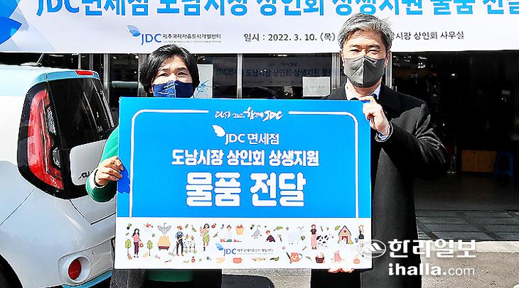 제주국제자유도시개발센터(JDC)는 지난 10일 제주시 도남시장 상인회 사무실에서 코로나19 장기화로 침체된 지역상권을 살리고 경영위기에 직면한 중소상공인을 지원하기 위해 물품 전달식을 가졌다.