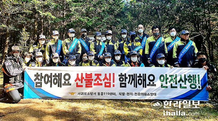 서귀포소방서 동홍119센터(센터장 이진형)와 직할·천지의용소방대는 지난 12일 솔오름 일대에서 ▷산림 연접지 무단 소각행위 단속 및 화재예방 순찰 ▷산불 피해 예방을 위한 '봄철 산불 예방 캠페인'을 실시했다.