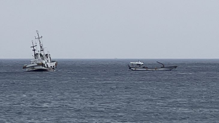 25일 오전 서귀포시 성산읍 성산포항 북서쪽 3.6㎞ 해상에서 좌초된 A호(왼쪽)의 모습. 서귀포해양경찰서 제공