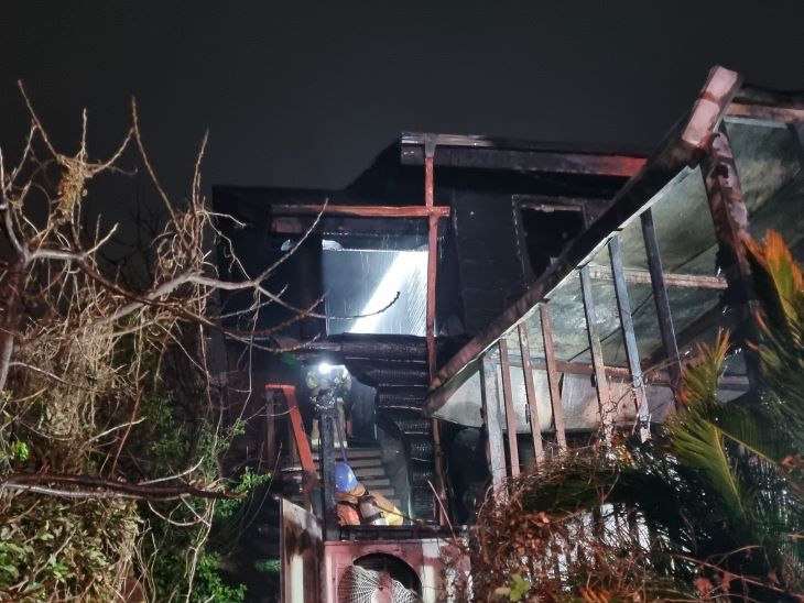 31일 새벽 제주시 애월읍 신엄리의 한 음식점 수족관에서 발생한 화재를 소방대원들이 진압하고 있다. 제주서부소방서 제공