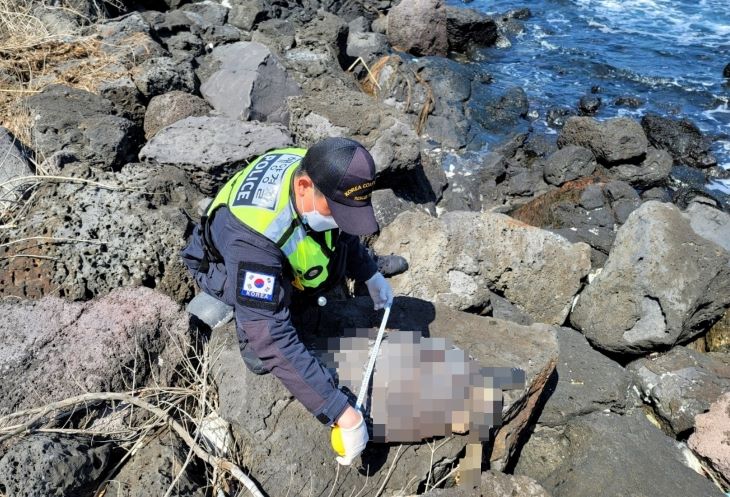 제주해경 한림파출소 순찰팀이 지난 3일 제주시 애월읍 고내포구 인근에서 발견된 푸른바다거북 사체를 채증하고 있다. 제주해양경찰서 제공