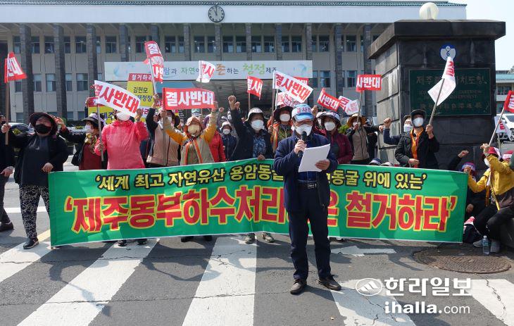 제주동부하수처리장 철거 월정리 비상대책위원회(이하 월정리 비대위)는 7일 제주도청 앞에서 기자회견을 열고 "용천동굴 역사문화환경에 있는 동부하수처리장은 문화재보호법 36조항의 건축허가 대상이 아니므로 즉각 철거하라"고 말했다.