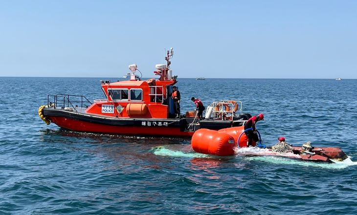 지난 9일 제주시 화북포구 북쪽 700m 해상에서 전복된 모터보트 A호를 해경이 예인하고 있다. 제주해양경찰서 제공