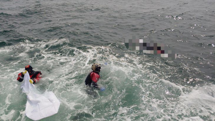 10일 오전 추자도 횡간도 인근 해상에서 발견된 변사자를 해경이 인양하고 있다. 제주해양경찰서 제공