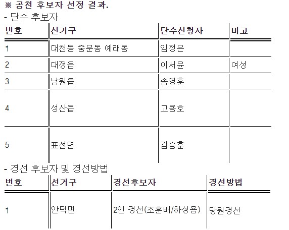 서귀포시 중 단수 후보 지역으로 정해진 선거구와 출마자는 대천동·중문동·예래동 선거구의 임정은 제주도의원을 비롯해 ▷대정읍 선거구 이서윤씨 ▷남원읍 선거구 송영훈 의원 ▷성산읍 선거구 고용호 의원 ▷표선면 선거구 김승훈 예비후보다.