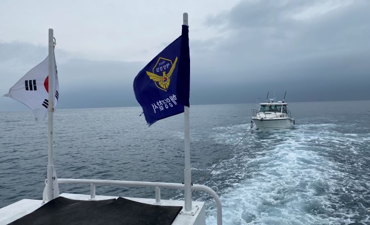 지난 23일 제주시 한경면 신창포구 인근 해상에서 표류하던 모터보트를 제주해경이 예인하고 있다. 제주해양경찰서 제공