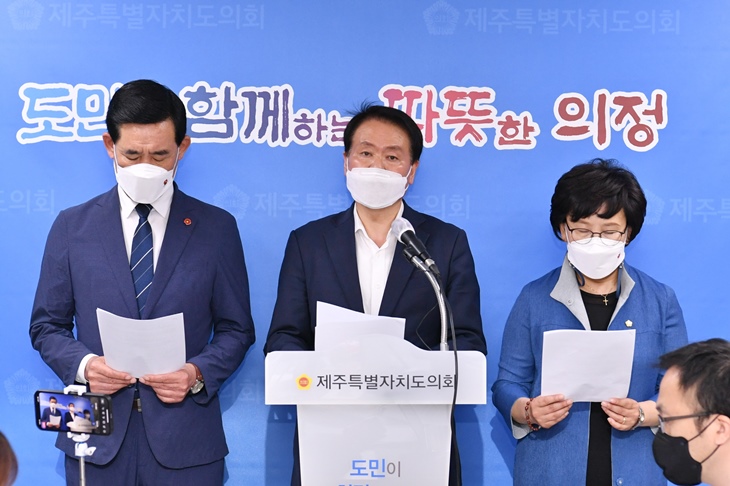 25일 기자회견하는 박호형 김희현 강민숙 제주자치도의회 의원.