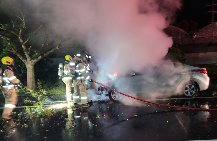 29일 새벽 서귀포시 강정동의 한 도로 화단 경계석을 들이받은 차량의 화재를 소방대원들이 진압하고 있다. 서귀포소방서 제공