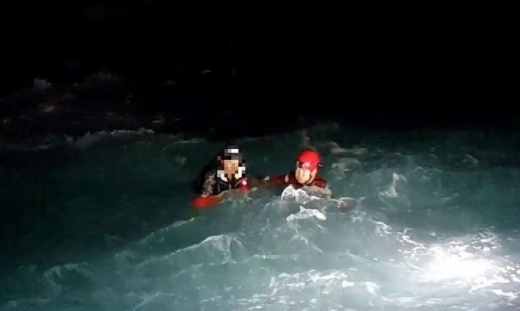 지난 28일 서귀포시 대정읍 하모리의 갯바위에 고립됐던 낚시객 A 씨를 해경 대원이 구조하고 있다. 서귀포해양경찰서 제공