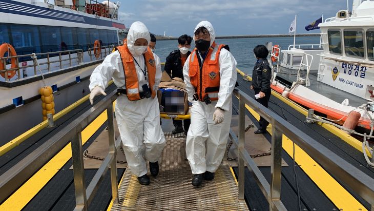 29일 오전 한림항으로 이송된 인도네시아 선원 B 씨를 제주해경 대원들이 이송하고 있다. 제주해양경찰서 제공