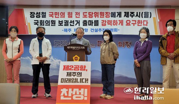 제주제2공항정상추진위원회는 2일 기자회견을 열고 장성철 전 위원장의 보궐선거 출마를 촉구했다. 김도영기자