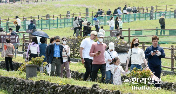 2일 실외 마스크 착용의무 해제 첫날 서귀포시 성산읍 성산일출봉을 찾은 도민과 관광객 대부분이 마스크를 착용하고 있다. 이상국기자