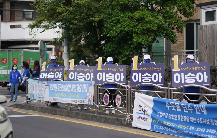 더불어민주당 이승아 도의원 후보가 19일 소음 없는 선거운동을 펼치고 있다. 이승아 후보 캠프 제공